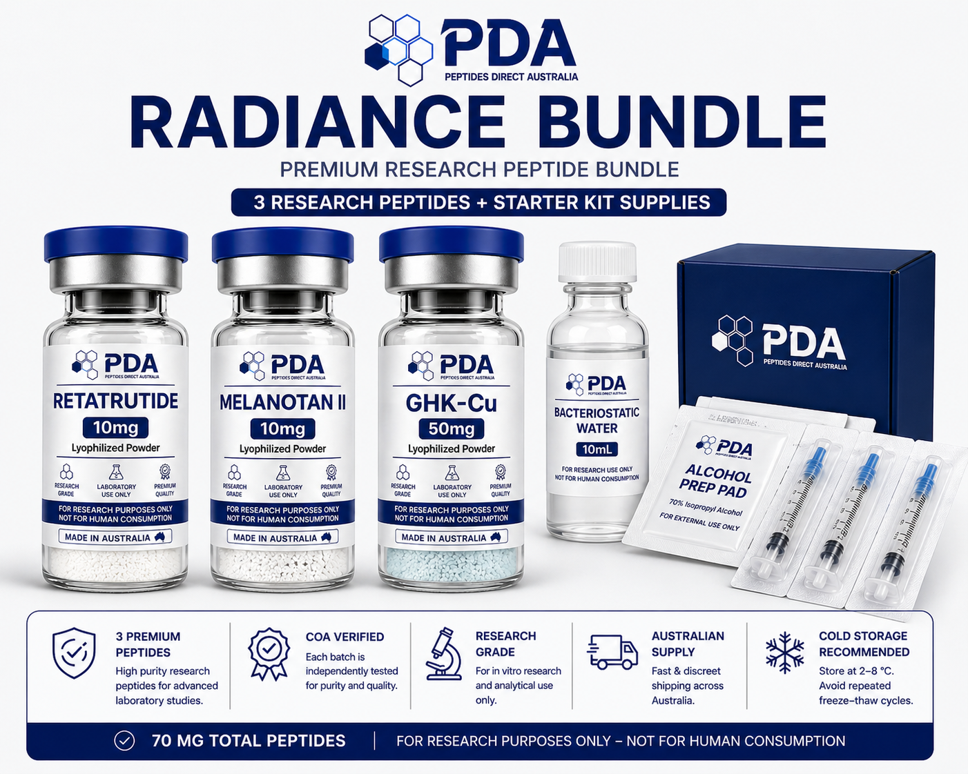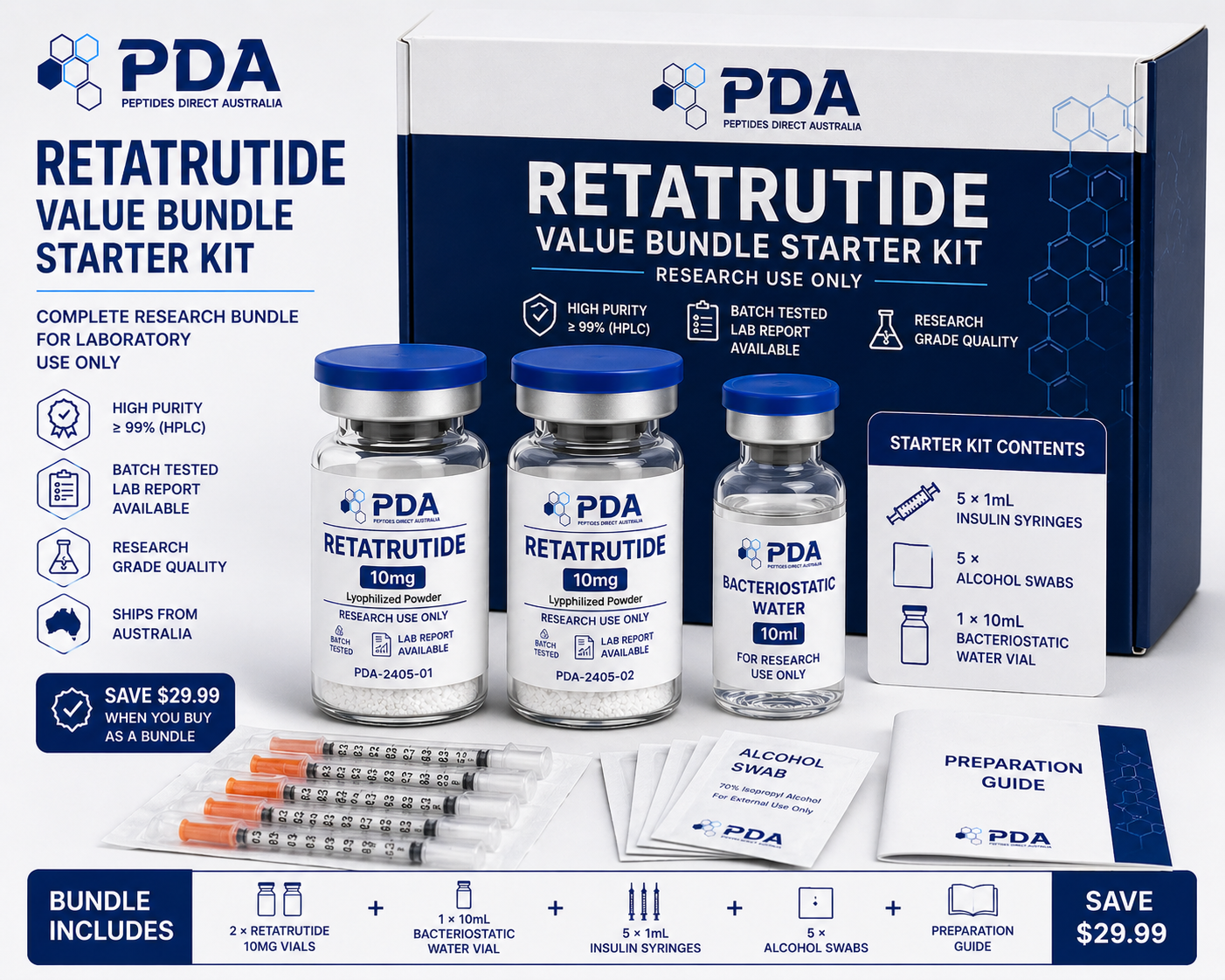 Buy Retatrutide starter kit in Australia. Complete bundle with 2ร 10mg vials and essential lab supplies for streamlined research setup.