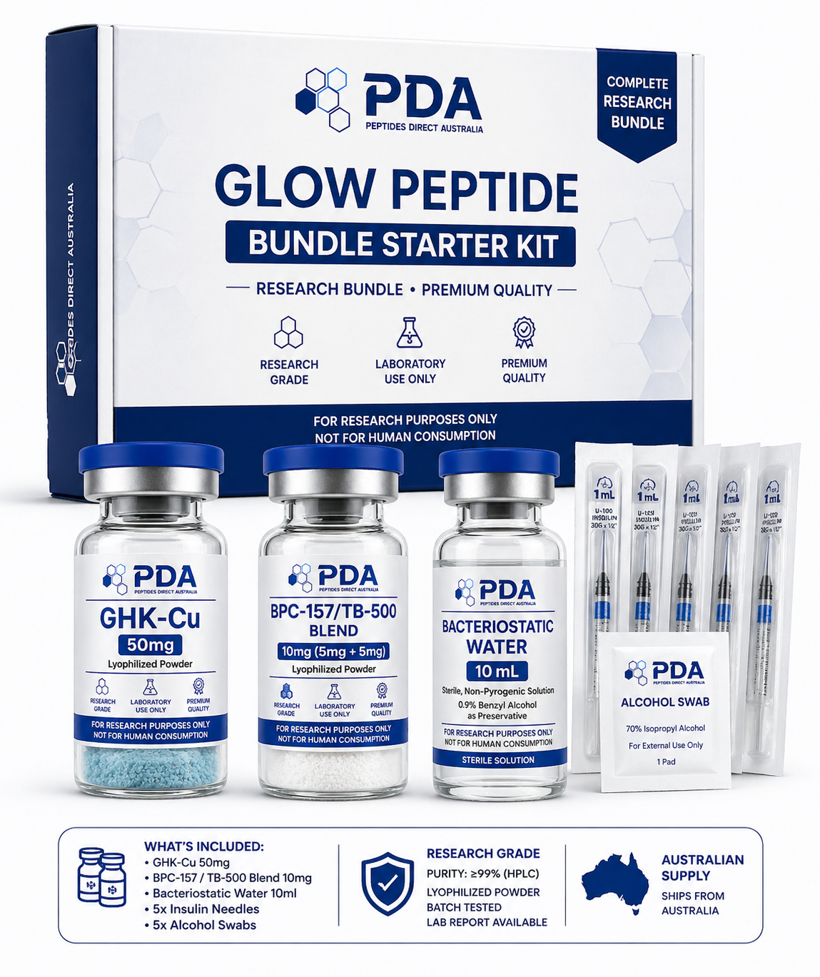 Buy GLOW peptide bundle in Australia. Complete research kit combining GHK-Cu and BPC-157/TB-500 with lab supplies for skin and tissue pathway studies.