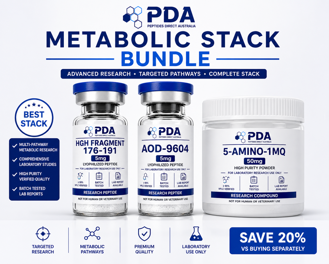 Buy metabolic peptide stack in Australia. Advanced research bundle combining HGH Frag 176-191, AOD-9604, and 5-Amino-1MQ for multi-pathway studies.