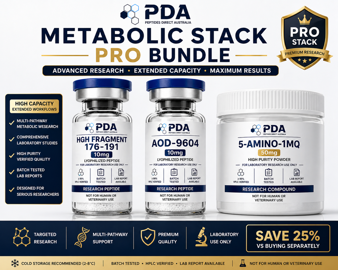 Buy Metabolic Stack PRO in Australia. High-capacity peptide stack with HGH Frag, AOD-9604, and 5-Amino-1MQ for advanced research workflows.