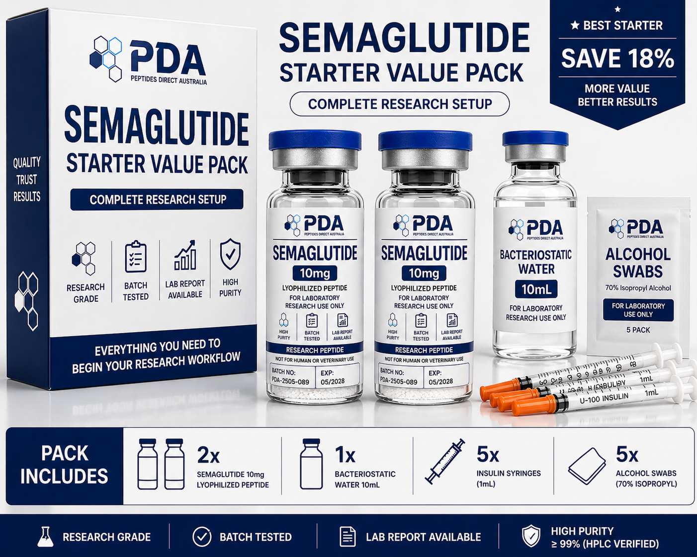 Buy Semaglutide starter kit in Australia. Complete bundle with 2ร 10mg vials and essential lab supplies for streamlined research setup.