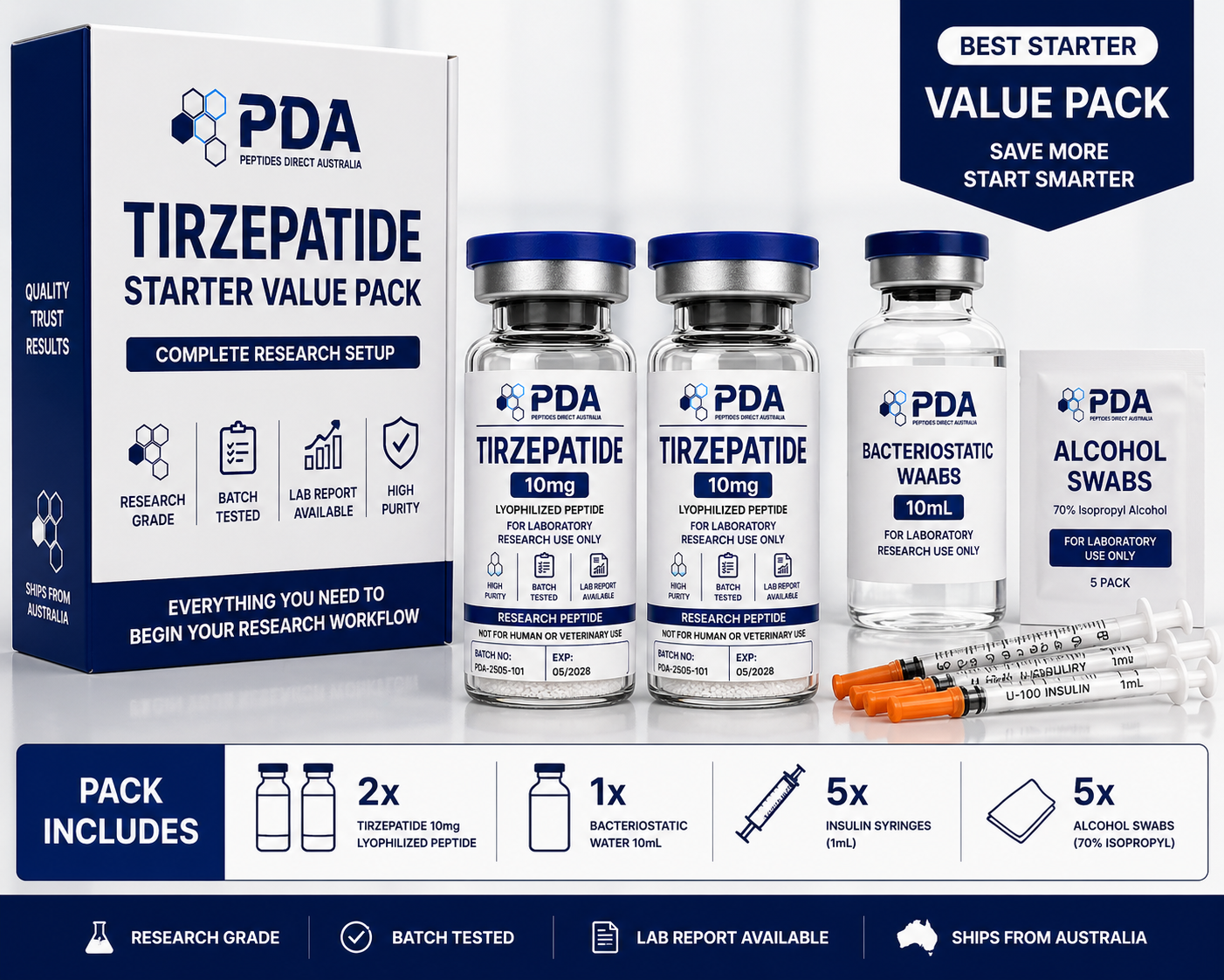 Buy Tirzepatide starter kit in Australia. Complete bundle with 2ร 10mg vials and essential lab supplies for streamlined research setup.