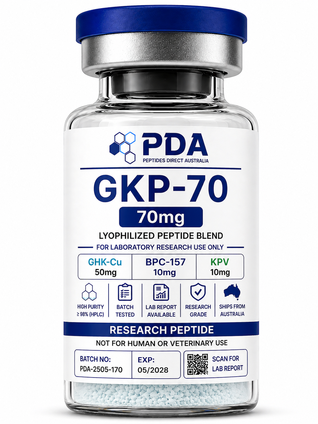 Buy GKP-70 70mg in Australia. Multi-peptide stack combining GHK-Cu, BPC-157, and KPV for cellular and pathway research.