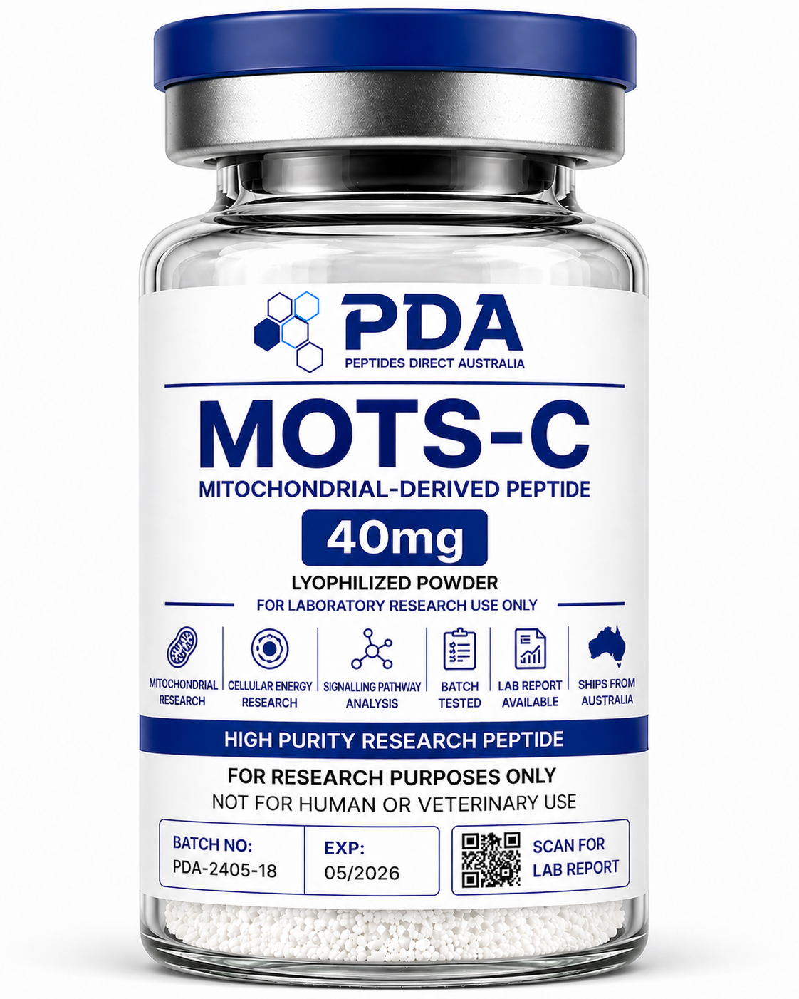 Buy MOTS-C 40mg in Australia. High-capacity mitochondrial-derived peptide supplied as a lyophilized powder for cellular energy and metabolic research.