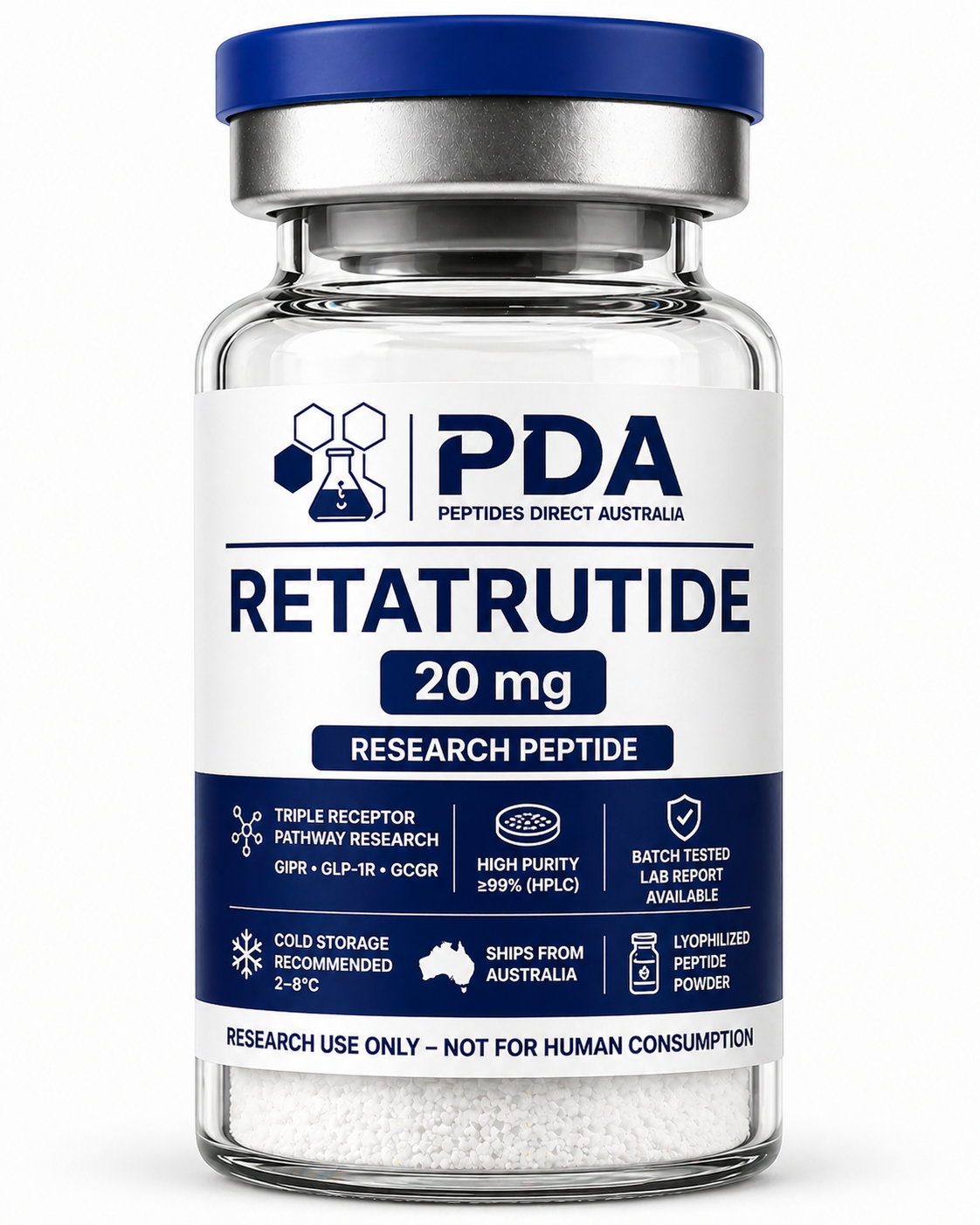 Buy Retatrutide 10mg in Australia. Research-grade peptide supplied as a lyophilized vial with fast Australian shipping.